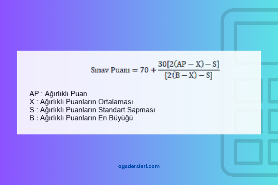 Milli Eğitim Bakanlığı, AGS puan hesaplama ile ilgili bir formül paylaştı. Ancak bu formüle göre şuan elimizde olmayan ve bilinmeyen değişkenler var. Sınav yapılmadan bu verilere ulaşmak mümkün değil ancak yine de formül görselini verelim.